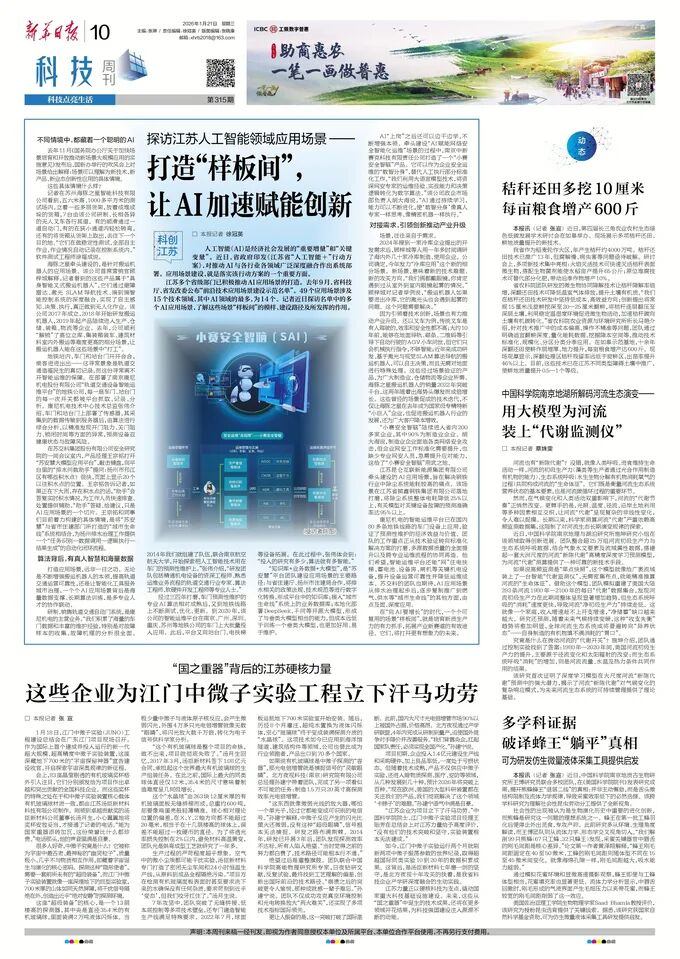 2026年1月21日,《新华日报》以《探访江苏人工智能领域应用场景——打造“样板间”, 让AI加速赋能创新》为题,报道了710公海寰宇等入选江苏省“前沿技术应用场景建设示范名单”企业,在应用场景建设方面的实践与成效。